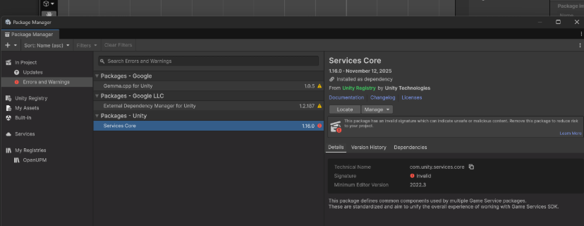 Unity 에디터의 Package Manager에서 Services Core 패키지가 빨간색 경고와 함께 “Invalid Signature” 표시